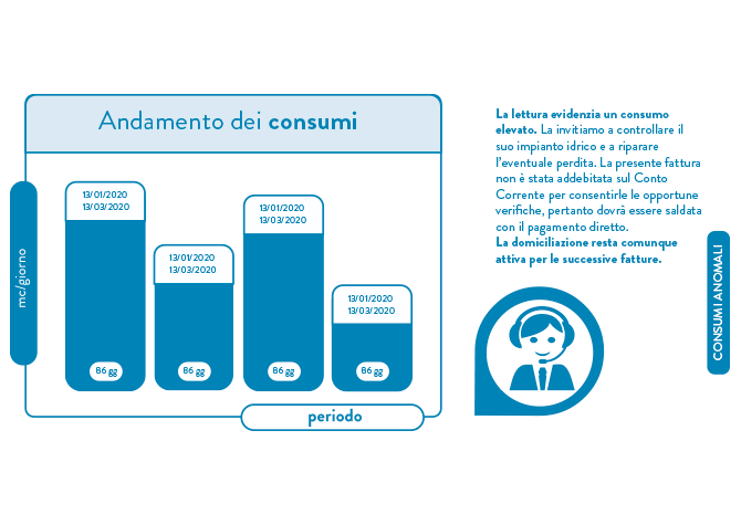 Alla fine della seconda pagina trovi alcuni consigli utili per preservare la risorsa idrica e ridurre gli sprechi. Nella sezione “Comunicazione ai clienti”, presente nella quarta pagina della fattura, vengono inserite eventuali comunicazioni dell’autorità d’ambito, aggiornamenti sulle normative applicate e le novità introdotte dal gestore.