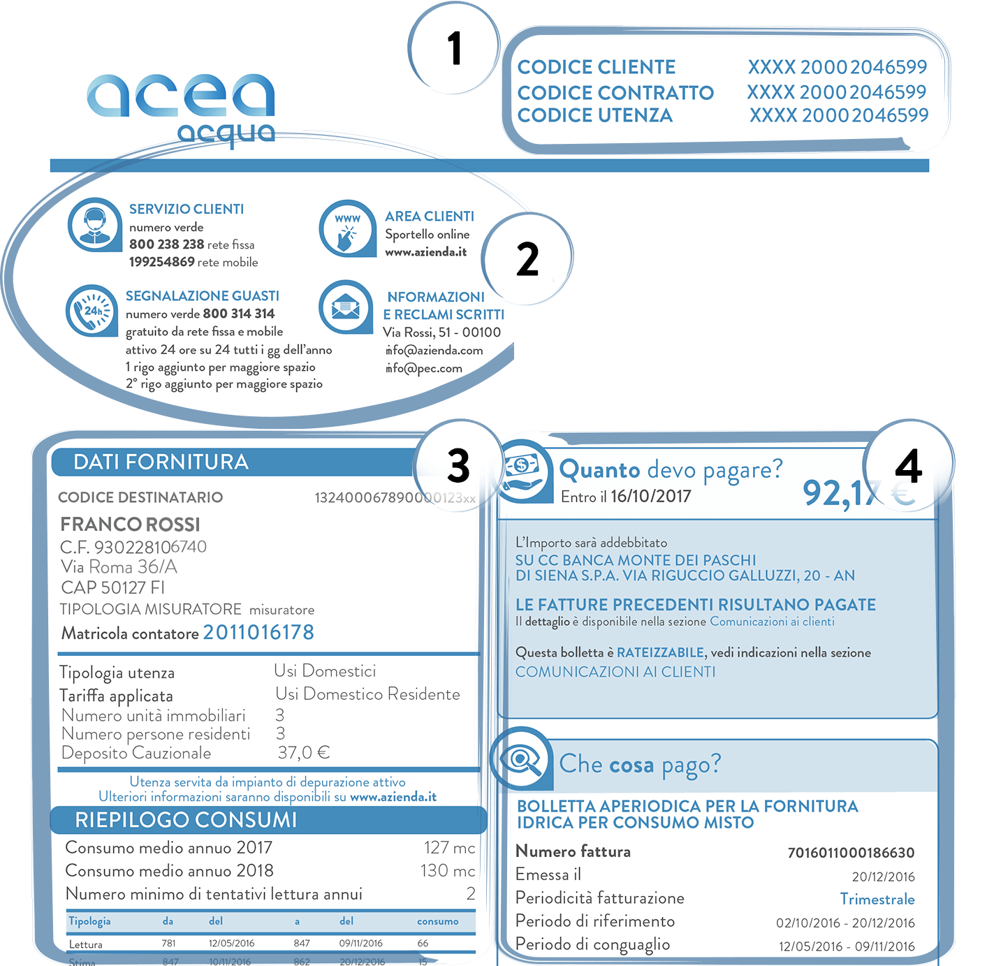 Prima di approfondire come si leggono le bollette dell’acqua, vediamo quali voci sono contenute al loro interno.